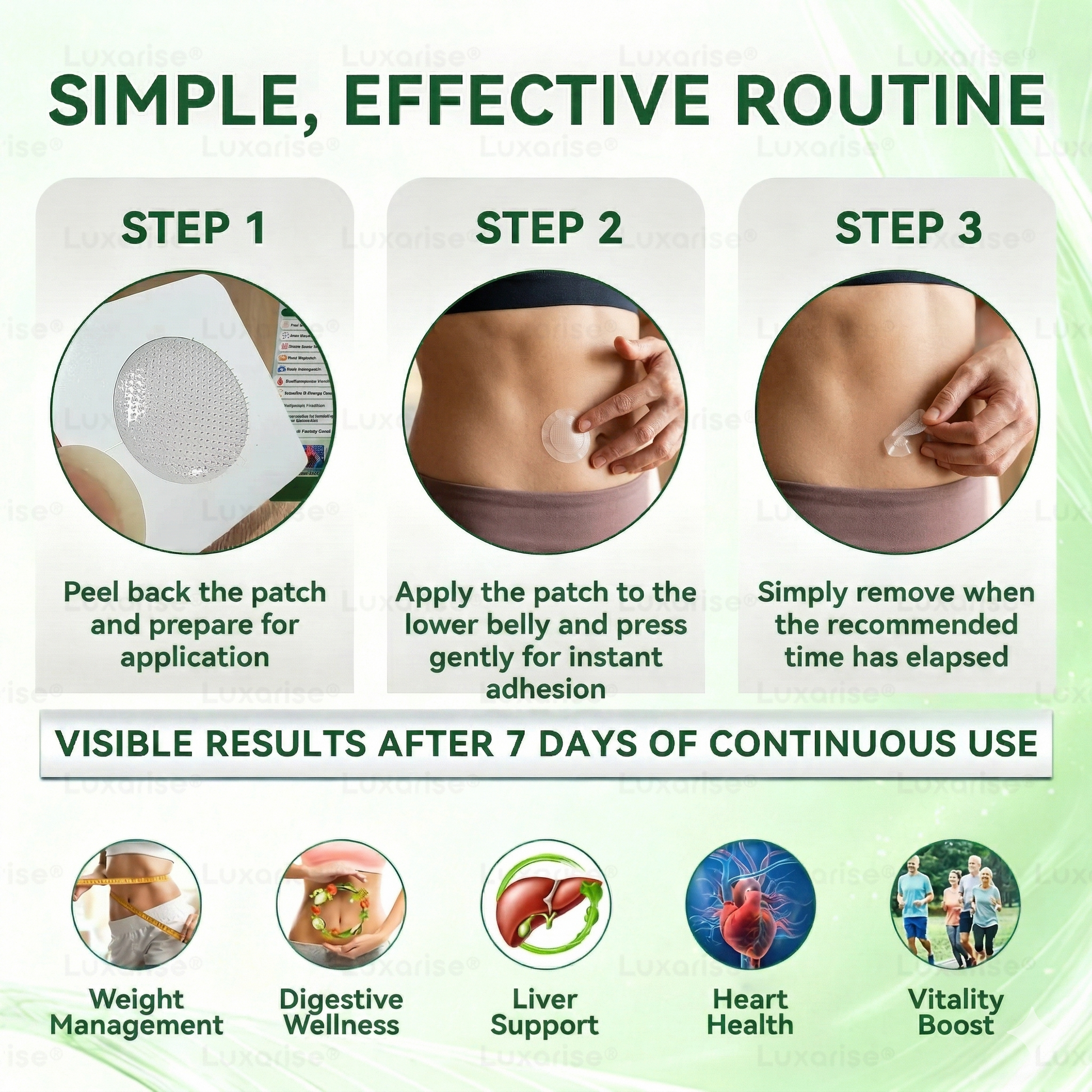 1. Daily Ritual for Optimal Results Apply one patch daily and wear it for a duration of eight hours. For maximum efficacy, we recommend applying the patch before you go to sleep, allowing the active ingredients to work in harmony with your body’s natural overnight restorative cycle.
