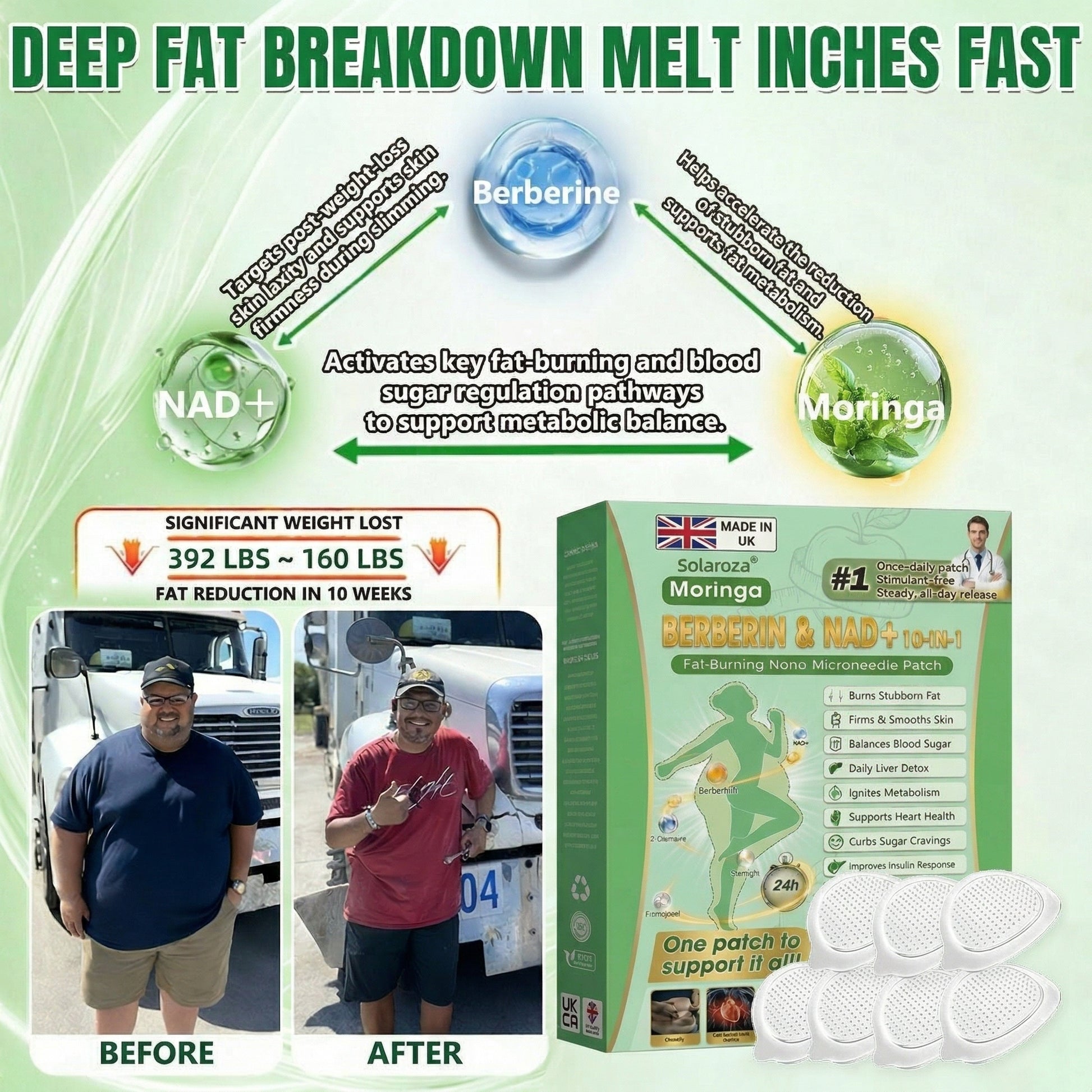 “I’m not sponsored, and no one paid me to say this. Four months ago, I could barely climb into my lorry without getting out of breath. Years of long-distance driving had completely drained my energy. The Solaroza® Moringa · Berberine × NAD+ 10-in-1 Advanced Nano Microneedle Patch honestly changed everything for me. I started using the patch daily, and by the third week, I had enough energy to handle a full 12-hour shift without struggling. No more afternoon crashes. No more relying on multiple energy drinks just to get through the day. Over 14 weeks, I lost 7 and a half stone, and for the first time in years, I actually feel like myself again—stronger, clearer, and full of life, like I’m back in my 40s.”
